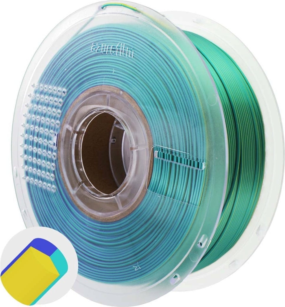 AzureFilm PLA Silk Multicolor tuo tulosteisiisi väriä ja vaikuttavaa eleganssia. Tämä filamentti yhdistää PLA:n helpon käsittelyn silkkisen kiiltävään pintaan, joka antaa jokaiselle objektille korkealuokkaisen ilmeen. Erityinen koostumus peittää kerrosviivat taitavasti, joten mallisi näyttävät yhtenäisiltä.