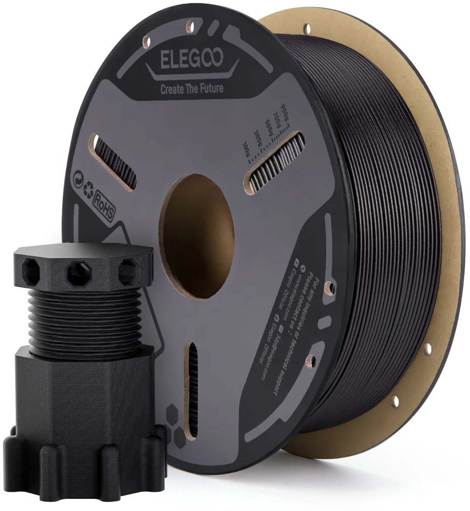 Verrattuna PLA-CF:ään, Elegoo PETG-CF tarjoaa selvästi korkeampaa sitkeyttä ja on vähemmän altis rikkoutumiselle ulkoisesta rasituksesta tai iskuista. Filamentti on lisäksi sulavammin työstettävissä ja katkeaa harvemmin tulostettaessa, mikä takaa vakaat ja luotettavat tulokset myös vaativissa projekteissa.