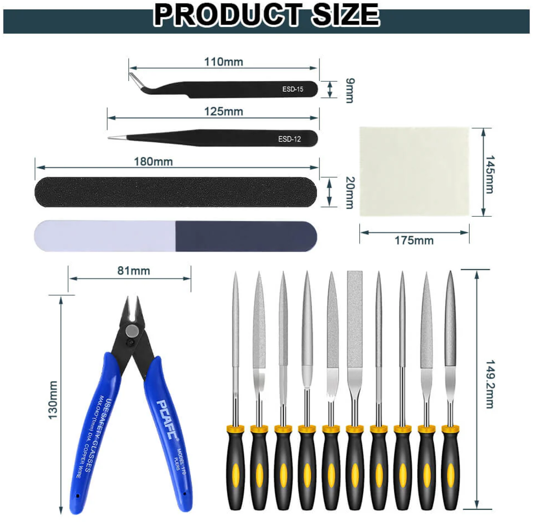 Epäsiistit reunat ja epätasaiset pinnat 3D-tulosteissasi ovat enää vain muisto, kun käytössäsi on Hanboost 3D Model Trimming Set! Tämä kattava malli viimeistely- ja kiillotussarja tarjoaa kaiken, mitä tarvitset tarkkaan trimmaamiseen, tasoittamiseen ja kiillottamiseen – tuloksena ammattilaistasoinen lopputulos!