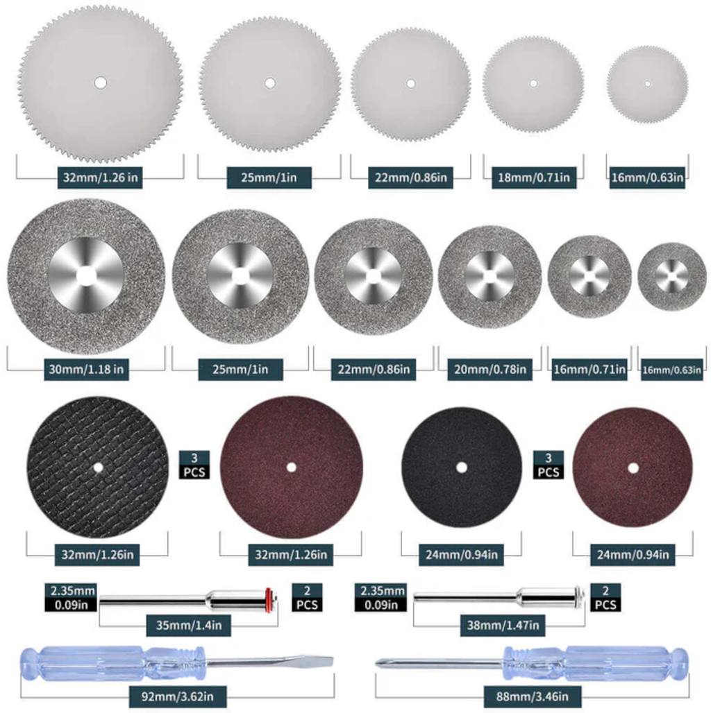 Hanboost Cutting Disc Set on ihanteellinen lisä Rotary Tool -laitteeseesi ja tarjoaa kattavan valikoiman korkealaatuisia leikkauslevyjä tarkkoihin ja monipuolisiin töihin. Mukana on HSS-kierrosahalevyjä, timanttipäällysteisiä katkaisulevyjä, hartsilevyjä sekä mini-ruuvimeisseleitä – siis kaikki, mitä tarvitset hienoihin leikkaustehtäviin erilaisissa materiaaleissa!