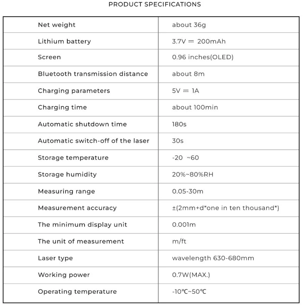 Laite mahdollistaa tarkat mittaukset ±2 mm tarkkuudella. Olipa kyseessä huonesuunnittelu, huonekalujen kokoonpano tai tee-se-itse-projektit – voit mitata nopeasti ja ehdottoman tarkasti.