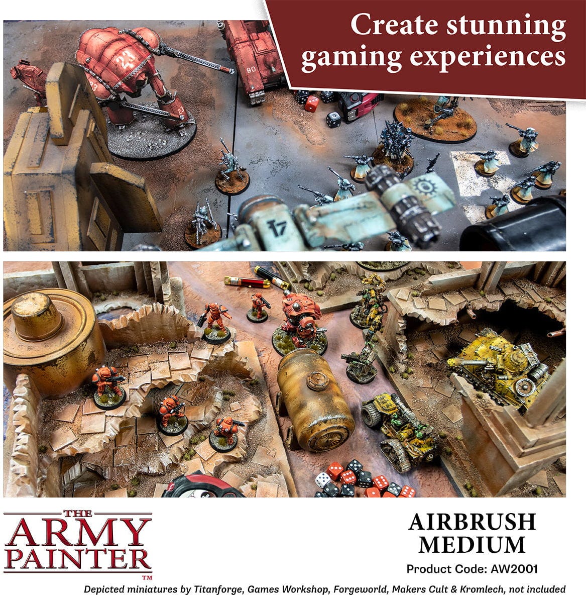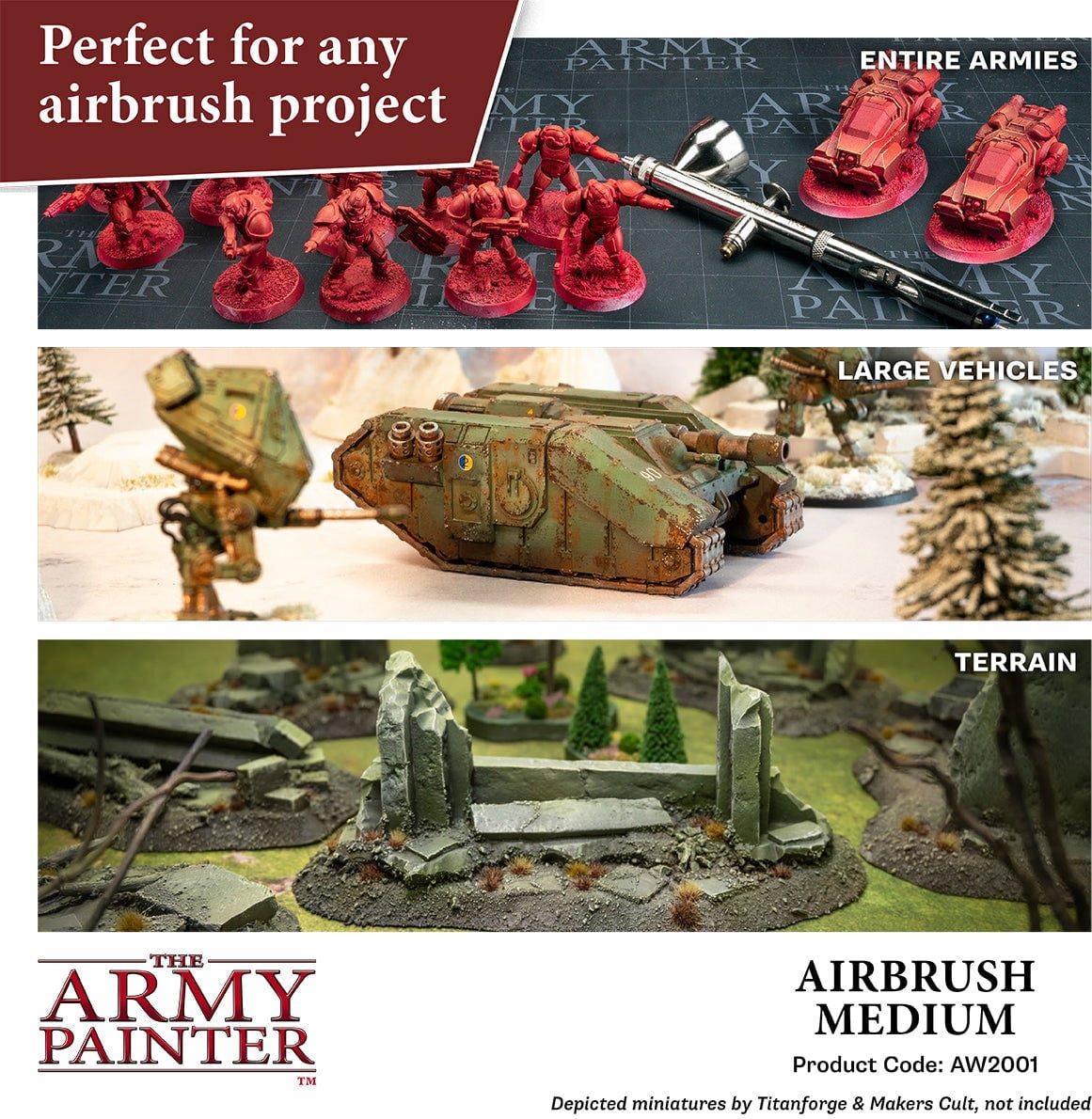 Airbrush Medium sopii kaikille laadukkaille akryyliväreille, mikä tekee siitä joustavan työkalun pienoismallien, tabletop-pelien ja luovien projektien parissa.