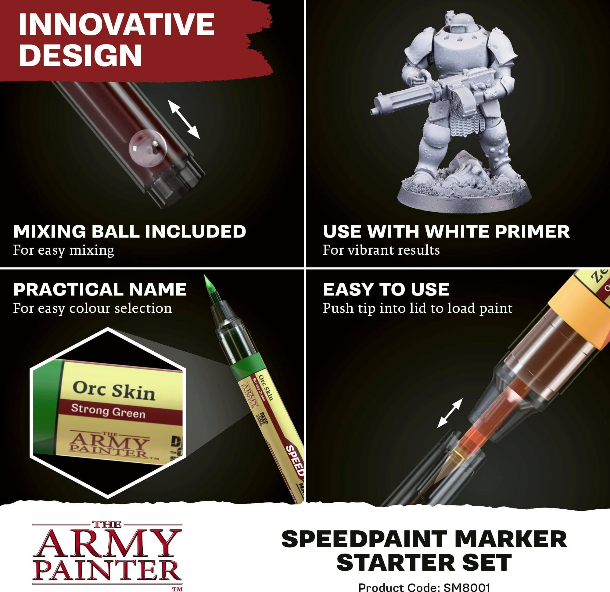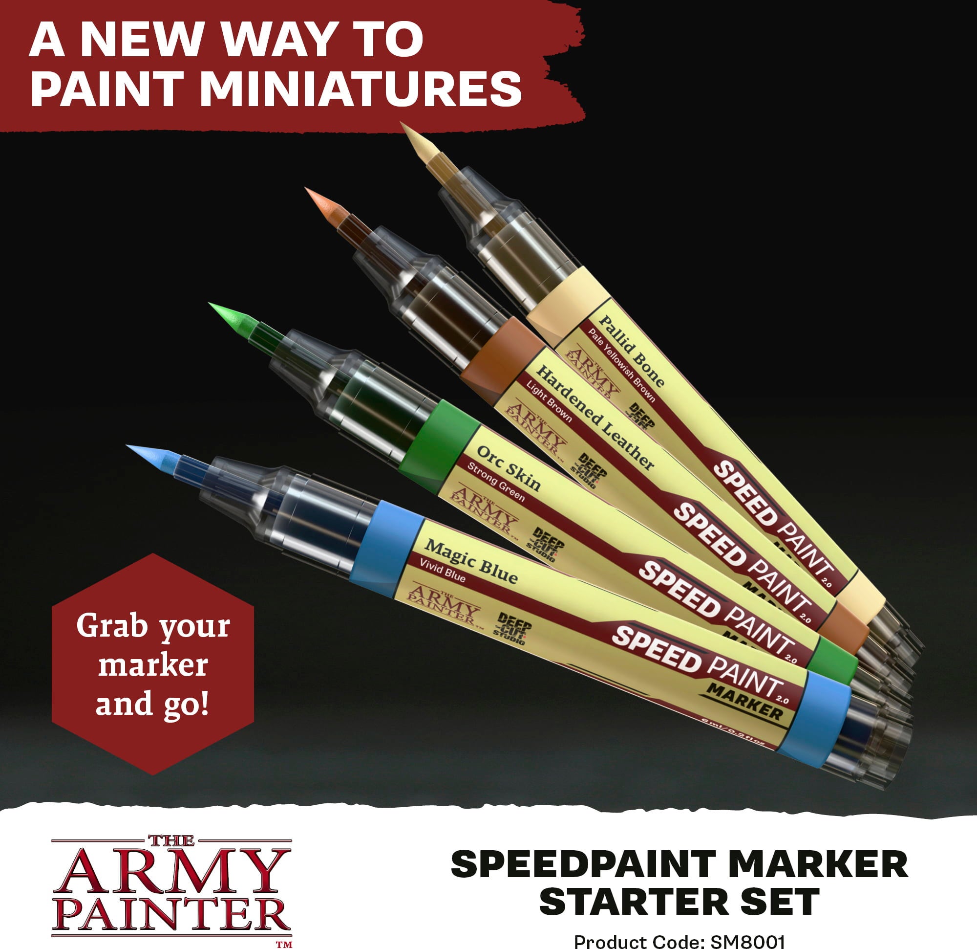 Unohda paletit, vesikupit ja väriläiskät – The Army Painterin Speedpaint Markereilla löydät täysin uuden tavan herättää miniatyyrisi eloon. Irrota vain korkki ja aloita maalaus – nopeasti, puhtaasti ja vaivattomasti!